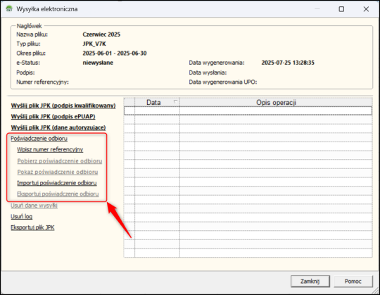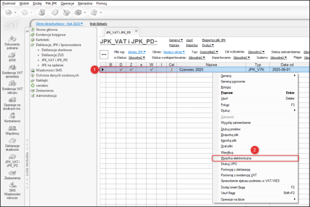 4. Po przesłaniu pliku i uzyskaniu numeru referencyjnego należy wprowadzić go w programie. W tym celu należy kliknąć Prawym Przyciskiem Myszy wyeksportowany wcześniej plik JPK, a następnie wybrać Wysyłka elektroniczna.