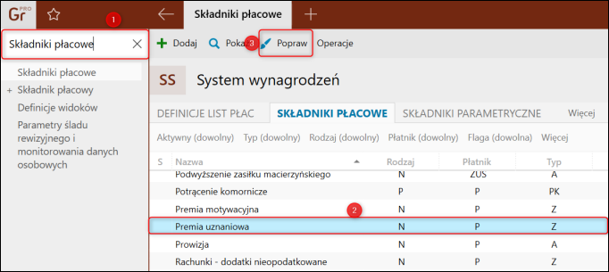 1. Wyszukać i przejść do modułu System wynagrodzeń, a następnie wskazać składnik i wybrać opcję Popraw.