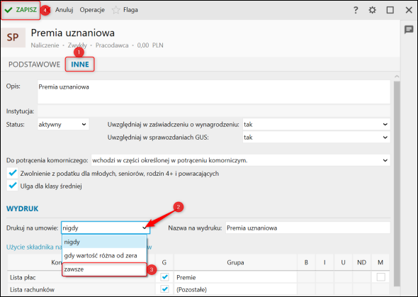 Gratyfikant nexo – Jak włączyć drukowanie na umowie składników z zerową wartością?