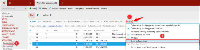 1. Przejść do modułu Rozliczenia – Rozrachunki. Kliknąć Więcej i aktywować zakładkę Sesje rozliczeniowe, jeśli widok nie została już wcześniej dodana.