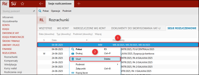 Program Rewizor nexo rejestruje każde rozliczenie rozrachunków w ramach sesji rozliczeniowej. Sesja rozliczeniowa jest zbiorem rozliczeń, które powstały w ramach wykonania jednej operacji. Aby usunąć wskazaną sesję rozliczeniową, należy:
