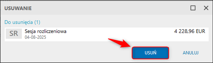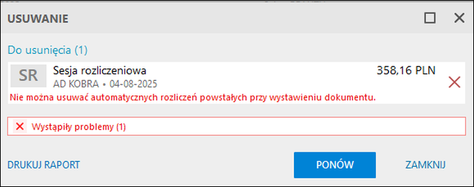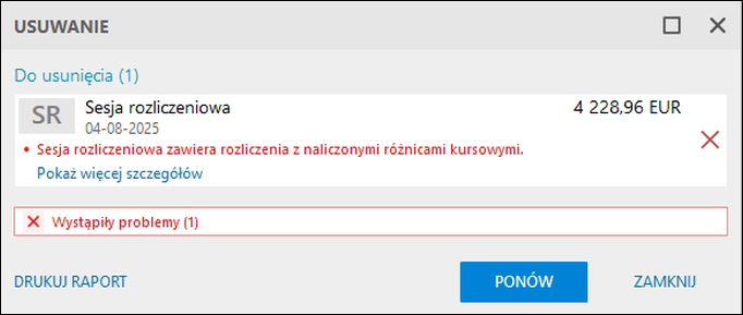 Możliwe problemy podczas usuwania Sesji rozliczeniowych