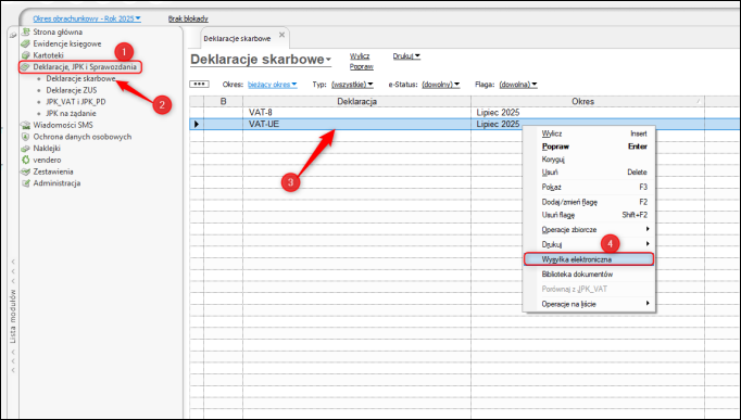 1. Przejść do modułu Deklaracje, JPK i Sprawozdzania – Deklaracje skarbowe, zaznaczyć wybraną deklarację prawym przyciskiem myszy i z menu kontekstowego wybrać Wysyłka elektroniczna.