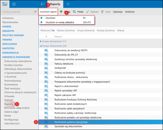 1. Przejść do modułu Raporty, wskazać Rozliczenie systemu kaucyjnego, a następnie skorzystać z opcji Uruchom raportUruchom.