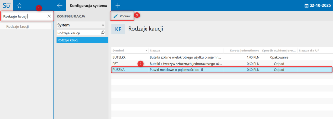 1. Wyszukać i przejść do modułu Rodzaje Kaucji. Wskazać dany rodzaj kaucji i wybrać z górnego menu Popraw. ​