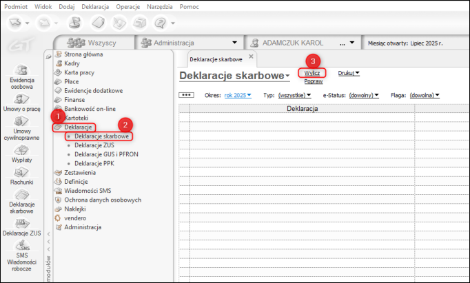 1. Z listy modułów wybrać Deklaracje – Deklaracje skarbowe i kliknąć Wylicz.