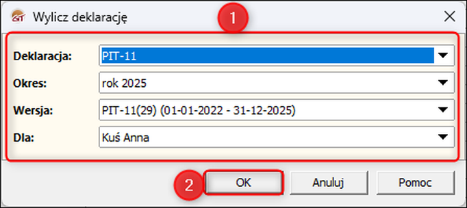 2. W oknie, które się wyświetli, wybrać z listy Deklaracja – PIT-11, odpowiedni Okres, Wersję, oraz wskazać osobę, dla której ma zostać wyliczona wspomniana deklaracja. Zatwierdzić przyciskiem OK.
