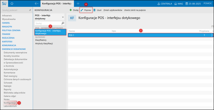 1. Przejść do KonfiguracjiKonfiguracje POS - interfejsu dotykowego, wybrać pozycję na liście i kliknąć Popraw.