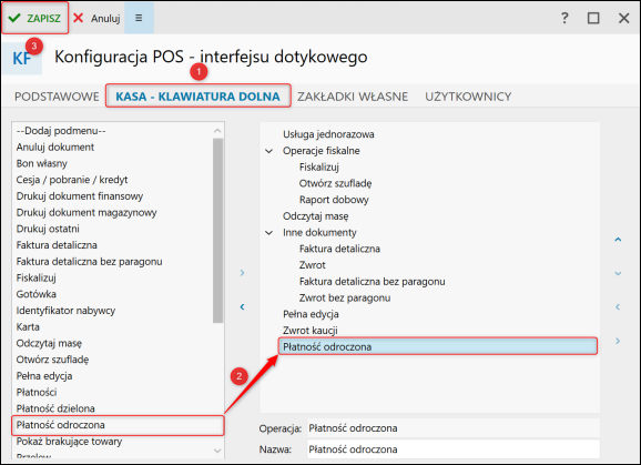 3. Na zakładce Kasa - Klawiatura dolna istnieje możliwość dodania przycisku Płatności odroczonej. Warto pamiętać, że w przypadku płatności odroczonej rata zawsze będzie tylko jedna – jeśli forma płatności definiuje więcej niż jedną ratę, pozostałe będą usuwane z dokumentu. Zatwierdzić zmiany przyciskiem Zapisz.