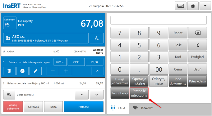 4. Podczas wystawiania dokumentu, po uzupełnieniu Nabywcy i wybraniu Towarów można skorzystać z dodanego przycisku Płatności odroczonej.