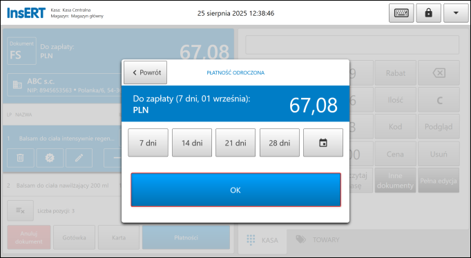 5.​ W oknie Płatność odroczona mo​żna wybrać jeden z czterech wcześniej zdefiniowanych terminów płatności lub wskazać termin ręcznie przy pomocy ikony kalendarza. Wybór zatwierdzić przyciskiem OK.
