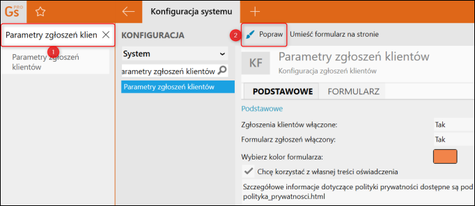 1. Wyszukać i przejść do Parametrów zgłoszeń klientów, a następnie kliknąć z górnego menu Popraw.