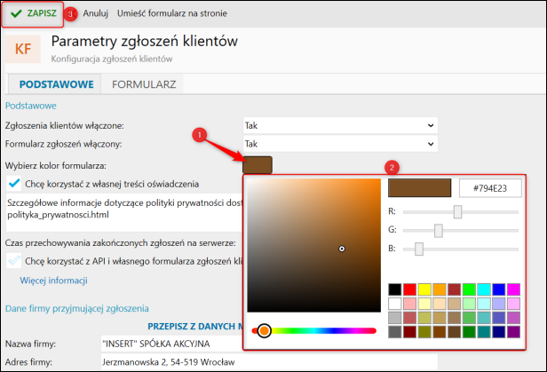 2. W sekcji Wybierz kolor formularza kliknąć zakolorowany prostokąt i wybrać preferowany odcień.