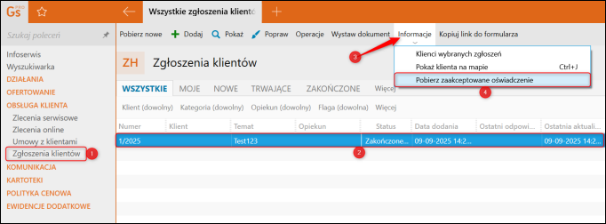 Aby wyświetlić zaakceptowane oświadczenie klienta, należy przejść do modułu Zgłoszenia klientów, zaznaczyć zgłoszenie, a następnie z górnego menu Informacje wybrać Pobierz zaakceptowane oświadczenie.
