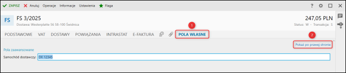 W celu przetestowania funkcjonalności należy przejść na zakładkę Pola własne na odpowiednim obiekcie w systemie i kliknąć Pokaż po prawej stronie.