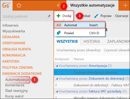 ​Moduł Automatyzacja ​pomaga w zautomatyzowaniu procesów w firmie. Użytkownik może np. zaplanować, aby w ślad za każdym utworzonym dokumentem handlowym, ofertą, umową lub zleceniem serwisowym powstawało działanie, a od wersji 57.0.0 programów serii InsERT nexo wpływać na konkretne pola na tym obiekcie. Automaty domyślnie są pogrupowane według typów obiektów. Aby dodać nowy automat ustawiający wartość wybrnego pola (w przykładzie będzie to ustawienie wartości pola własnego "Samochód dostawczy" do zlecenia serwisowego na podstawie nadania zielonej flagi), należy: