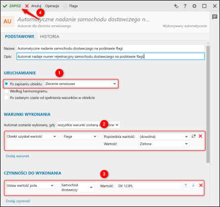 2. Wybrać typ dokumentu w sekcji uruchamianie, określić warunki i wybrać czynności do wykonania​. W prezentowanym przykładzie, po nadaniu zielonej flagi dla zlecenia serwisowego, automat uzupełni pole własne Samochód dostawczy na podaną wartość.