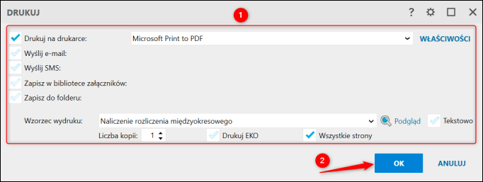 3. Wybrać odpowiednie ustawienia wydruku i zatwierdzić przyciskiem OK.