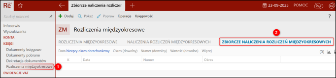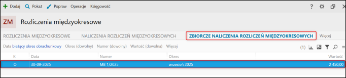 1. Przejść do modułu Księgi – Rozliczenia międzyokresowe, otworzyć zakładkę Zbiorcze naliczenia rozliczeń międzyokresowych.