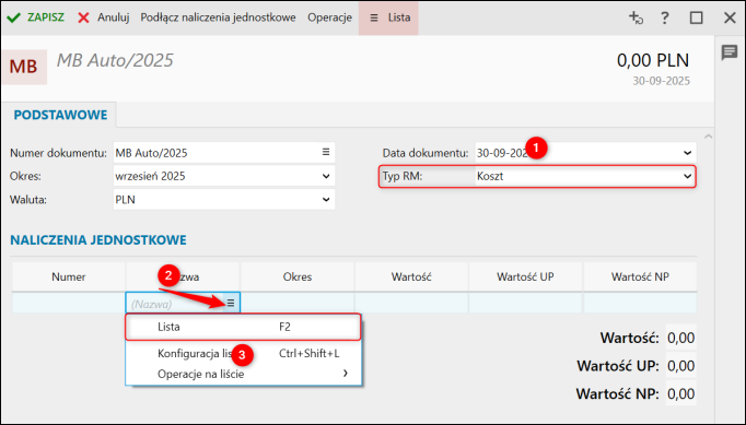 3. Wskazać odpowiedni Typ RM, kliknąć ≡, następnie Lista.