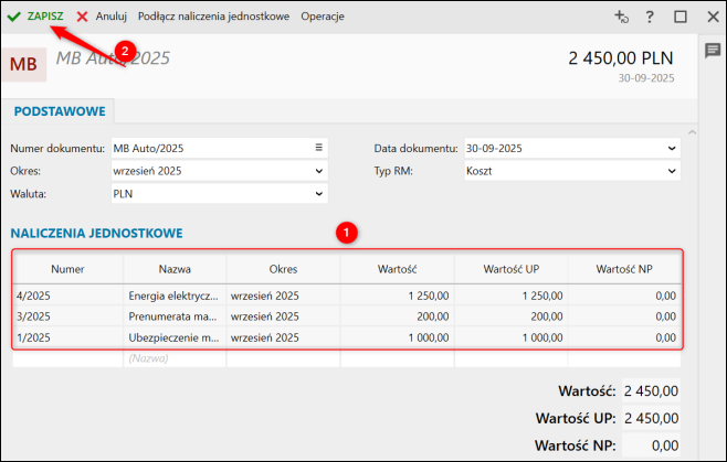 5. Wybrane naliczenia zostaną podłączone w sekcji Naliczenia jednostkowe. Zapisać dokument przyciskiem Zapisz.