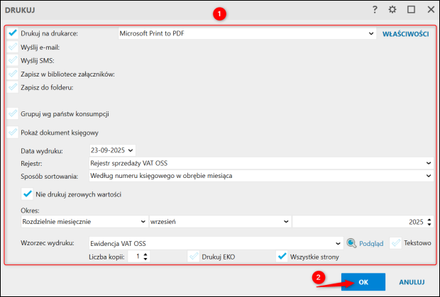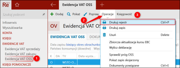 1. Przejść do modułu Ewidencje VATEwidencja VAT OSS, z górnego menu wybrać OperacjeDrukuj rejestr.
