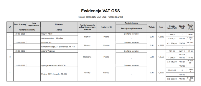 Przykładowy wydruk ewidencji VAT OSS prezentuje się następująco: