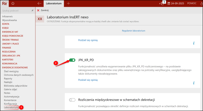 1. Przejść do modułu Laboratorium, aktywować funkcję JPK_KR_PD.
