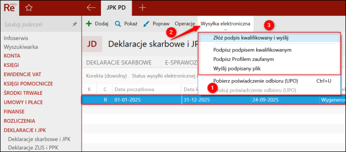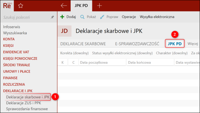 2. Otworzyć moduł Deklaracje skarbowe i JPK, następnie zakładkę JPK PD.