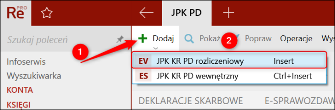 3. Z górnego menu wybrać Dodaj – JPK KR PD rozliczeniowy. Na potrzeby testowe istnieje również możliwość wygenerowania pliku wewnętrznego, który nie wymaga księgowania dokumentów.