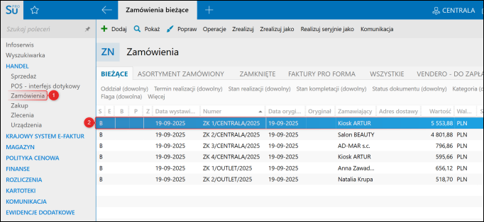 1. Przejść do modułu Zamówienia, a następnie zaznaczyć wybraną pozycję.