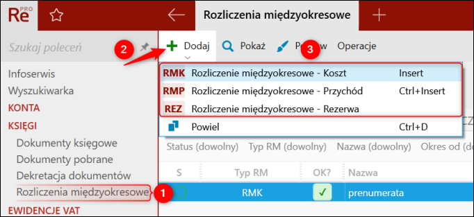 1. Przejść do modułu Księgi – Rozliczenia międzyokresowe, z górnego menu wybrać Dodaj i wybrać jedną z dostępnych opcji.