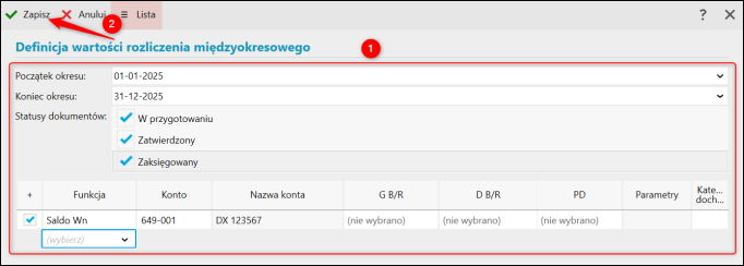 3. Dobrać parametry rozliczenia międzyokresowego, zdefiniować odpowiednie funkcje kont i kliknąć Zapisz.