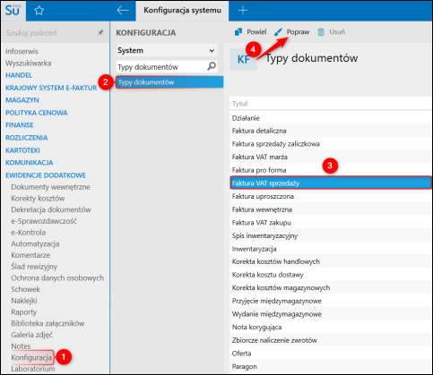 1. Przejść do modułu Konfiguracja – Typy dokumentów, wybrać pozycję na liście, kliknąć Popraw.