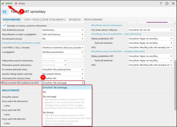 2. W polu Pilnuj numerów WZ wysłanych do KSeF wskazać jedną z opcji i kliknąć Zapisz.