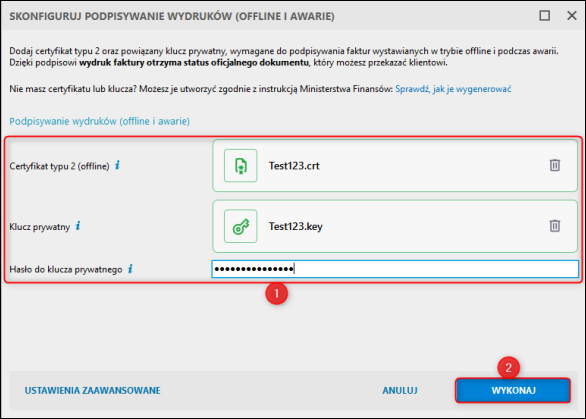 10. Dodać lub przeciągnąć plik z Certyfikatem oraz Kluczem prywatnym, uzupełnić Hasło do klucza prywatnego i kliknąć Wykonaj.