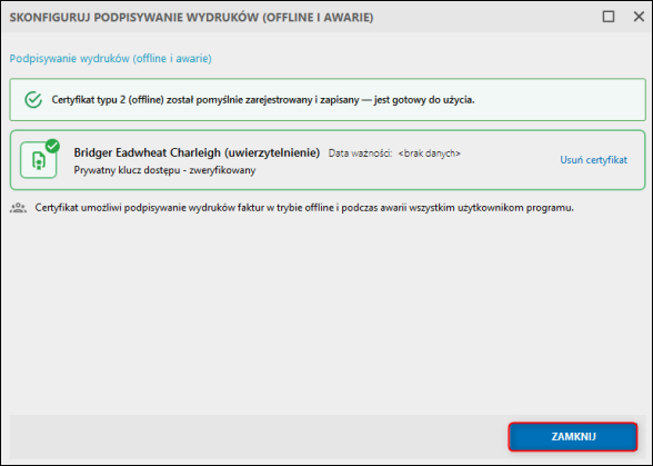 11. Po Autoryzacji zostanie wyświetlony Status rejestracji certyfikatu KSeF. Kliknąć Zamknij.