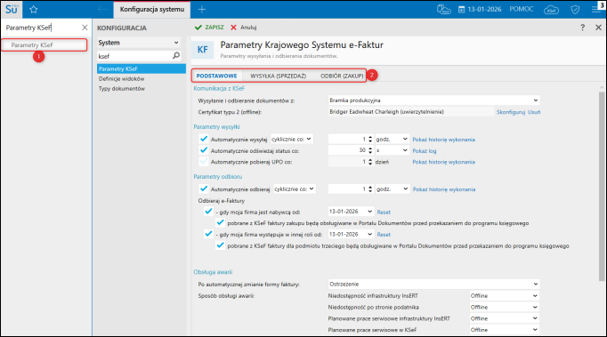 Pozostałe ustawienia dotyczące KSeF znajduje się w module Parametry KSeF w odpowiednich zakładkach. Artykuł e-Pomocy opisujący zaawansowaną konfigurację KSeF dostęny jest tutaj.