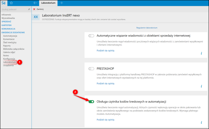 1. Otworzyć Ewidencje dodatkowe – Laboratorium i aktywować funkcjonalność Obsługa czytnika kodów kreskowych w automatyzacji.
