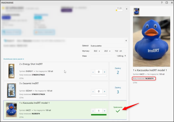 Zeskanowane asortymenty w oknie Pakowanie zostaną automatycznie dodane do paczki.