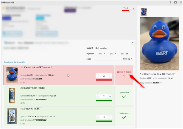 Jeśli liczba zeskanowanych produktów przekroczy ilość przewidzianą dla danego zamówienia, pojawi się stosowny komunikat.