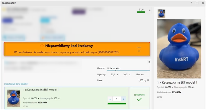 W przypadku zeskanowania artykułu nieprzypisanego do paczki program zakomunikuje to w odpowiedni sposób.