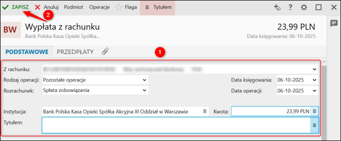 2. W polu Rodzaj operacji wskazać Pozostałe operacje, w razie potrzeby uzupełnić pole Rozrachunek oraz dodatkowe dane, wpisać kwotę i zapisać przyciskiem Zapisz.