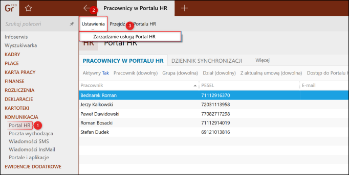 1. Przejść do modułu Portal HR, a następnie skorzystać z opcji UstawieniaZarządzanie usługą Portal HR.