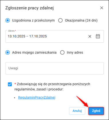 2. Uzupełnić dane dotyczące pracy zdalnej, a następnie kliknąć Zgłoś.