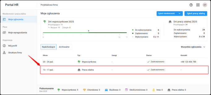 3. Zgłoszona praca zdalna będzie widoczna na liście w module.