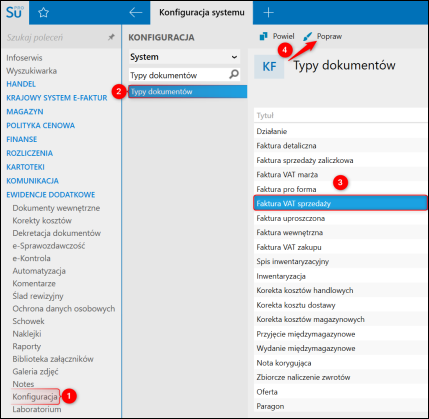1. Uruchomić moduł Konfiguracja – Typy dokumentów, wybrać pozycję na liście i kliknąć Popraw.