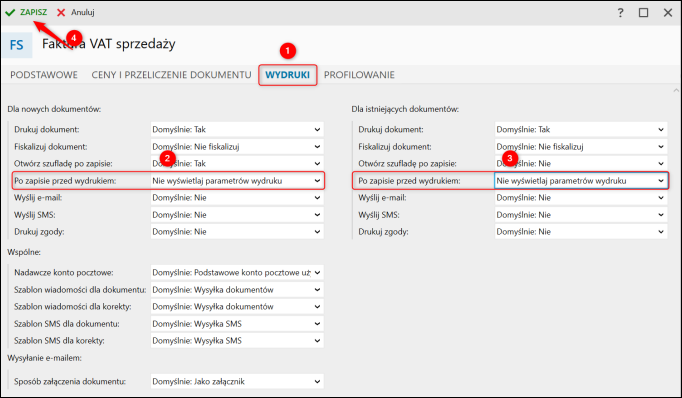2. Przejść do zakładki Wydruki, a następnie w sekcjach Dla nowych dokumentów oraz Dla istniejących dokumentów w polach Po zapisie przed wydrukiem wybrać opcję Nie wyświetlaj parametrów wydruku. Zatwierdzić zmiany przyciskiem Zapisz.