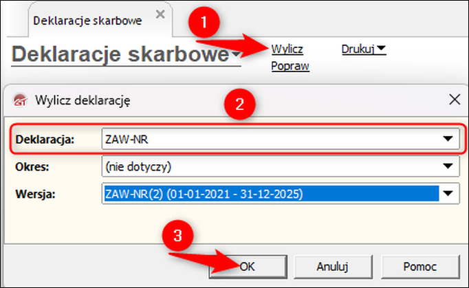 2. Kliknąć Wylicz, w oknie, które się wyświetli w polu Deklaracja wskazać ZAW-NR i kliknąć OK.