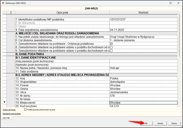 4. Zapisać deklarację klikając OK.
